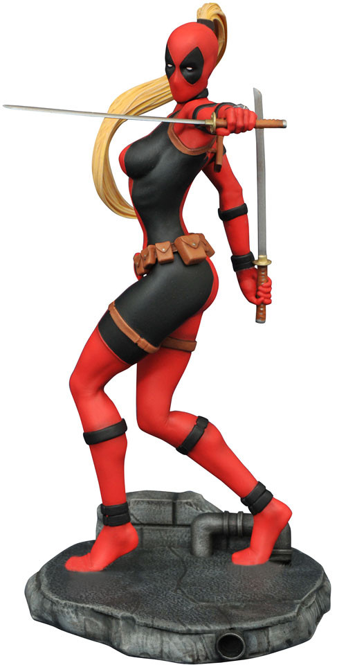 She's beautiful! She's deadly! She's Lady Deadpool, and she's the newest PVC figure based on the Marvel Universe! The most fatal of the Marvel femmes so far, Lady Deadpool stands approximately 23 cm tall and wields twin katana swords and a pretty killer ponytail atop a small diorama base. She is in scale to other Femme Fatales PVC figures.