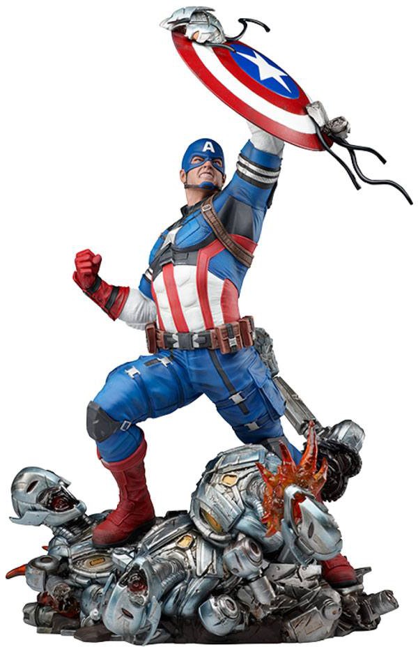 The fully sculpted Captain America Statue measures 15" tall as the Star-Spangled Avenger, clad in his signature red, white, and blue attire, defends a city from a horde of evil robots. Using his circular shield, Steve Rogers delivers a crushing blow to his enemy while standing on a pile of defeated drones. From his determined expression to his strong stance over that metallic rubble, Captain America proves he is undoubtedly one of Earth's Mightiest Heroes.