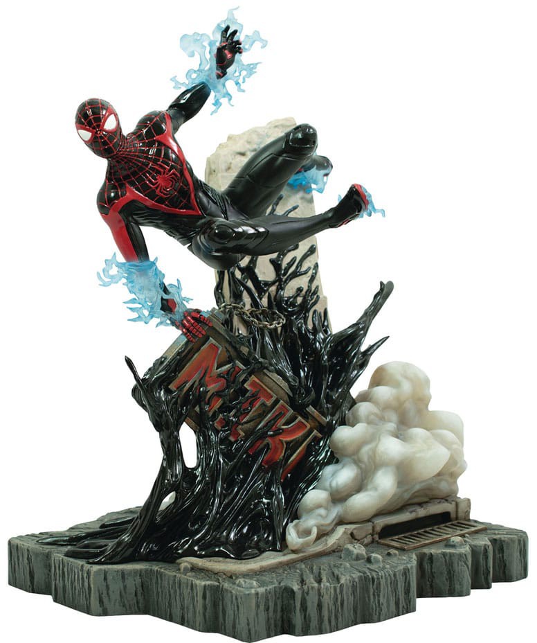 From the hit video game Marvel's Spider-Man 2, it's Miles Morales in an all-new Gallery Diorama! Leaping over a falling sign as the Venom symbiote oozes over it, Miles charges up energy blasts to take on the alien villain! This approximately 10-inch statue is made out of high-quality PVC and features detailed sculpting and paint applications. It comes packaged in a full-color window box. Designed by Nelson X. Asencio, sculpted by John Cleary!