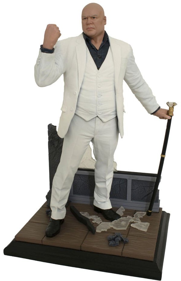 The Kingpin has arrived! This Gallery Diorama of Vincent D'Onofrio as YTV's Kingpin is based on his appearance in the Hawkeye TV series. Wearing his white suit & black shirt and carrying his diamond-headed cane, The Kingpin stands amid the wreckage of his fight with Kate Bishop. Measuring approximately 10" tall, this sculpture is made out of high-quality PVC and comes packaged in a full-color window box. Designed by Nelson X. Ascencio and sculpted by Rocco Tartamella!