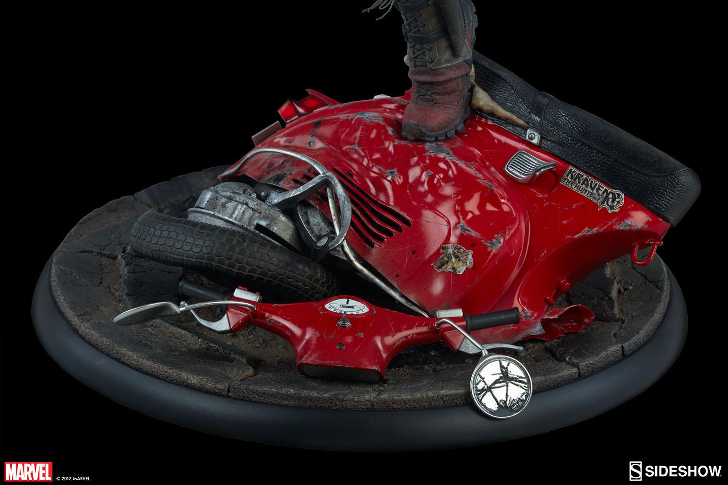 The Lady Deadpool Premium Format Figure stands 56 cm tall on top of a damaged red scooter base, decorated with fun stickers that hold fourth wall-breaking references. She kicks into action with her signature blonde ponytail waving in the wind, posed precariously while redirecting a missile in midair and simultaneously slicing a bullet in half with her katana. Lady Deadpool is raising a gun to the air as she makes her dynamic attack. With a swap-out accessory, see her launch the infamous Headpool into the air, armed to the teeth with explosive dynamite.