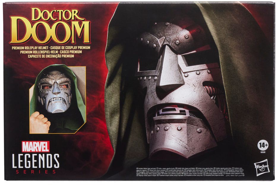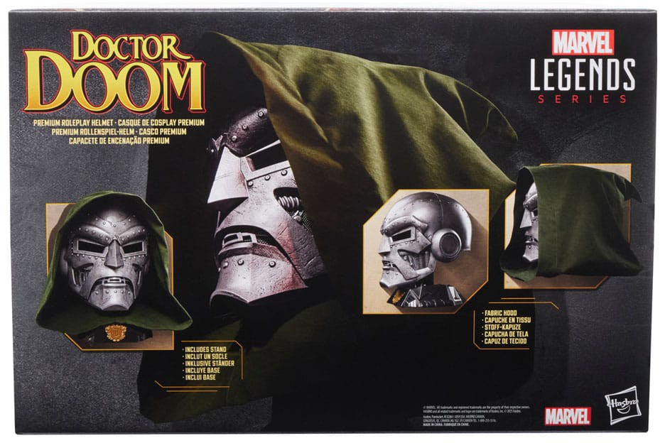 Hasbro Marvel Legends proudly presents this 1:1 scale reproduction of Doctor Doom's classic helmet! Roleplay helmet with premium design and deco is inspired by the character's signature look in Marvel Comics. Marvel roleplay set comes with a green fabric hood inspired by Doctor Doom's signature robe. Includes a stand and is great for displaying in fans' collections or wearing with a Doctor Doom Halloween costume or Marvel cosplay. Imagine pitting the brilliant mind of Victor Von Doom against Reed Richards and the Fantastic Four! Bring comics-inspired scene to life with Marvel Legends action figures, roleplay gear, and collectibles. (Each sold separately. Subject to availability.)