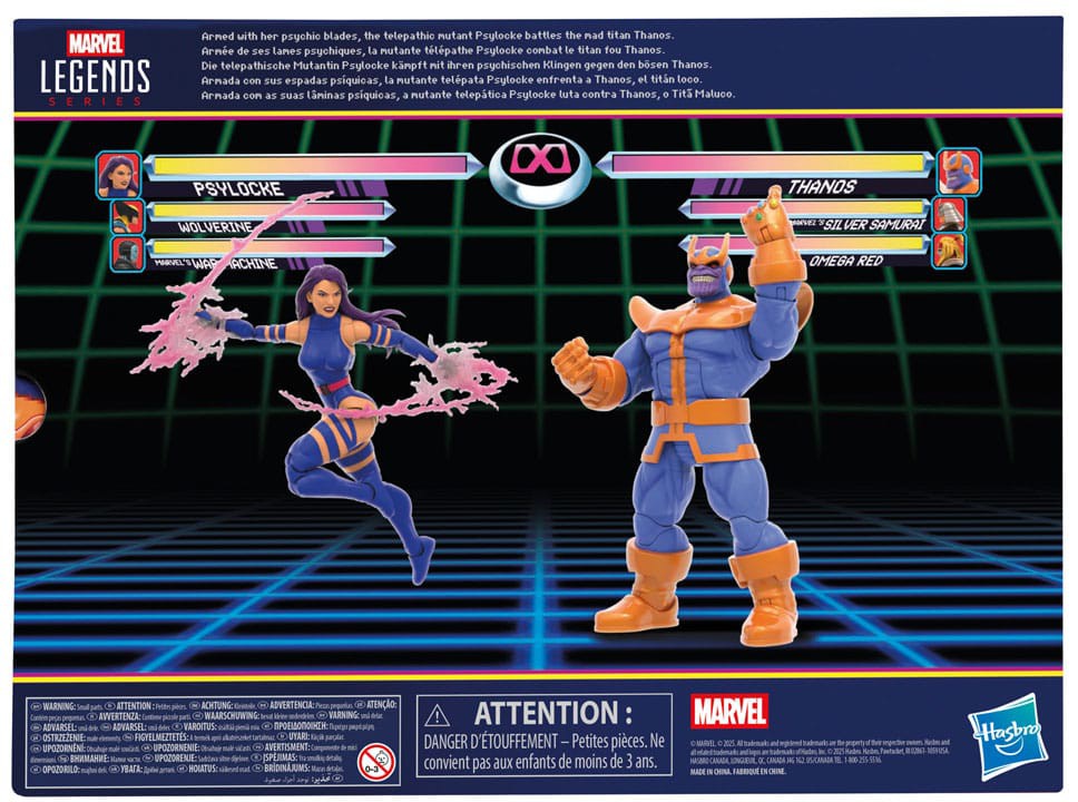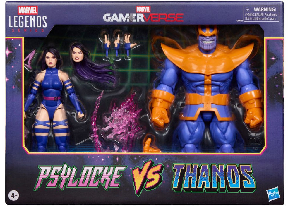 Bring the excitement and wonder of the Marvel Universe to your collection with Hasbro Marvel Legends Psylocke and Thanos action figures! These collectible 6-inch scale Marvel figures are inspired by the characters' appearance in classic Marvel video games. Figures are fully articulated with premium design and poseable heads, arms, and legs. Marvel action figure set comes with 9 accessories, including attachable power FX pieces for Psylocke and alternate hands for both figures. Hasbro Marvel action figures' 6 inch scale make them great for displaying in fans' collections. Reimagine gaming-inspired scenes on your shelf with Marvel collectibles.