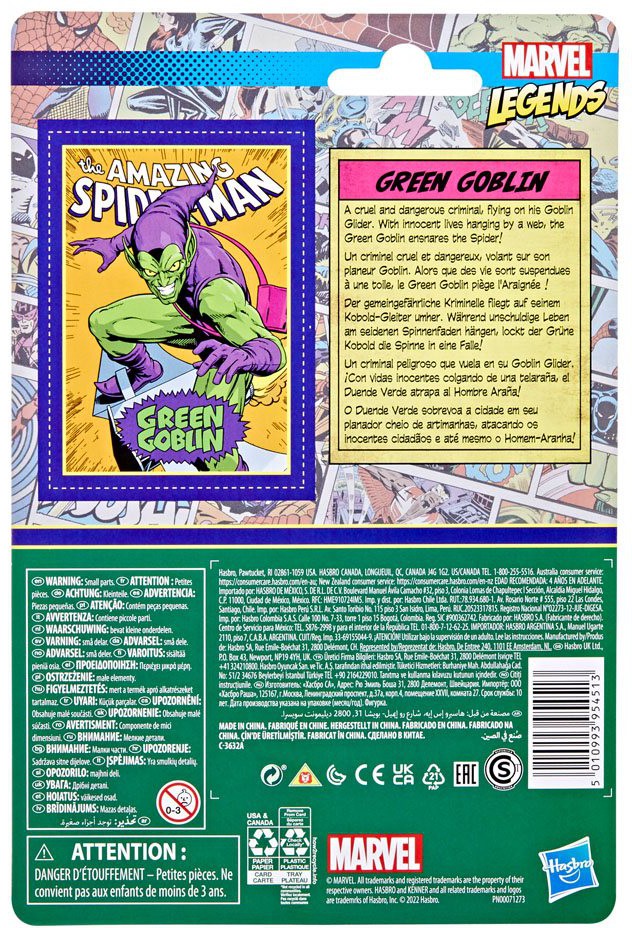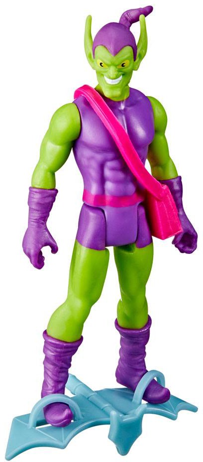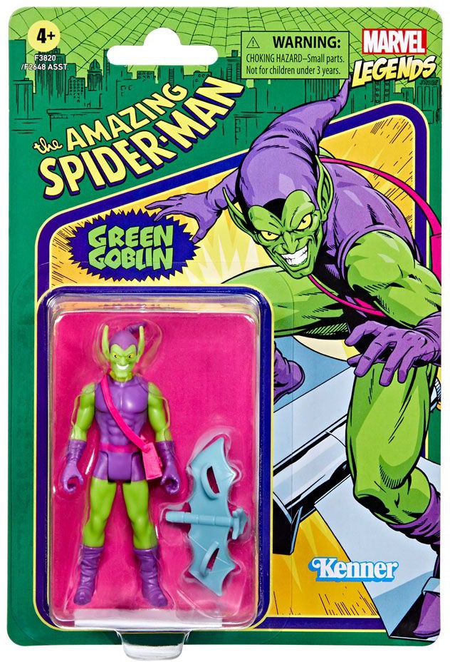 This quality 3.75-inch Legends Series Retro 375 Collection Green Goblin figure features multiple points of articulation and his signature Goblin Glider accessory.