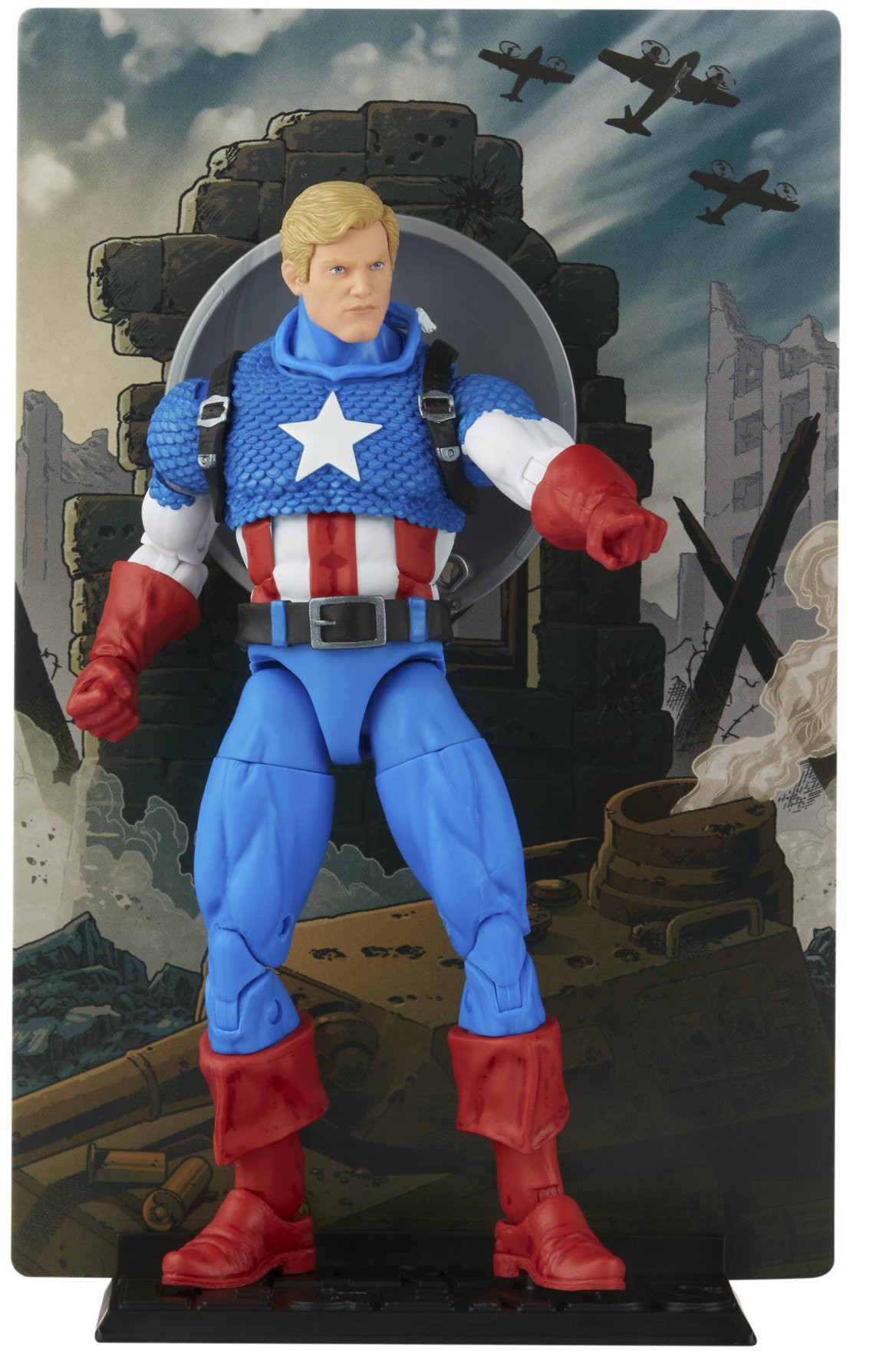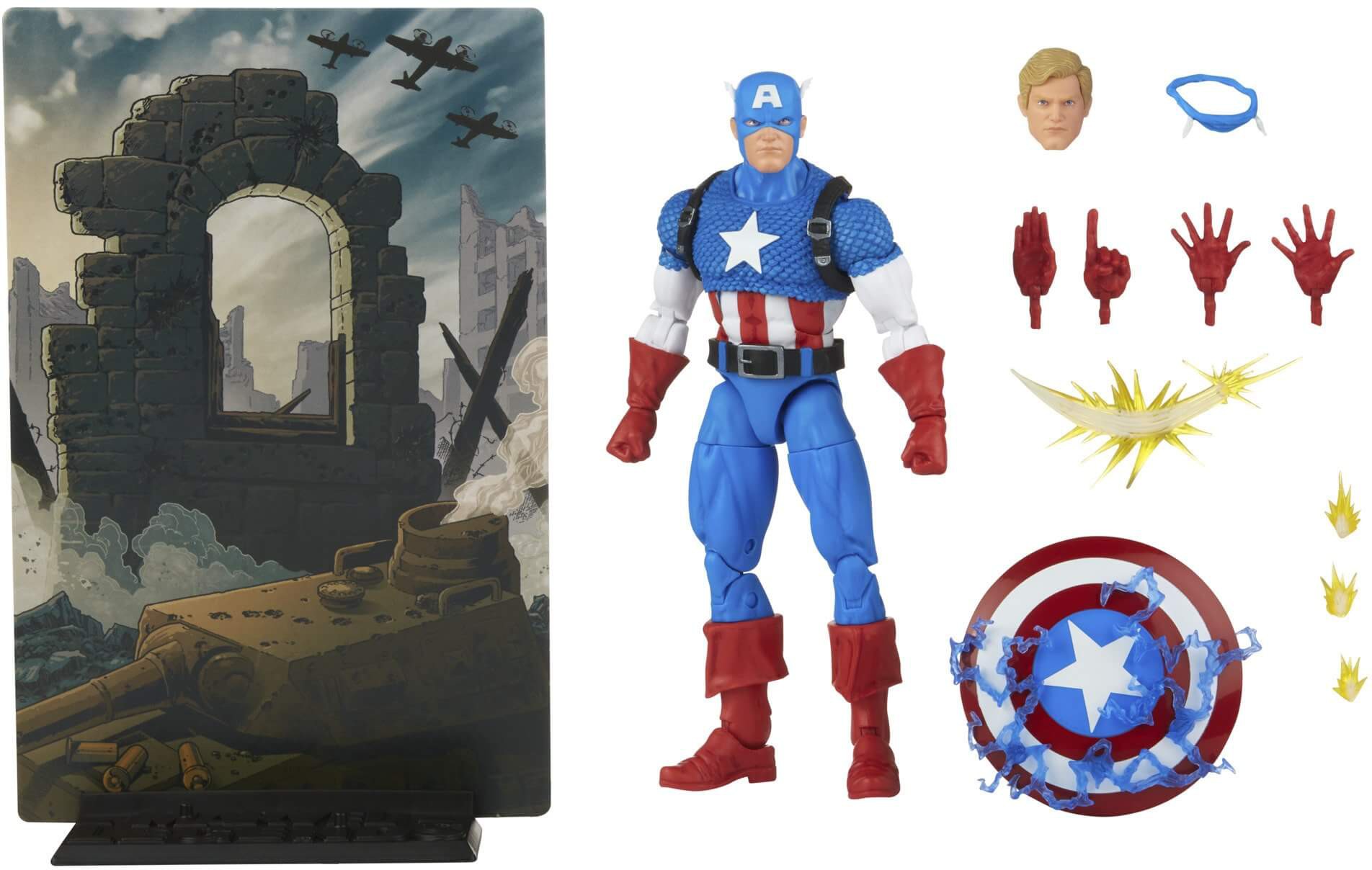 The Series 1 Captain America figure comes with a whopping 14 accessories and a comics-inspired reversible backdrop for display.