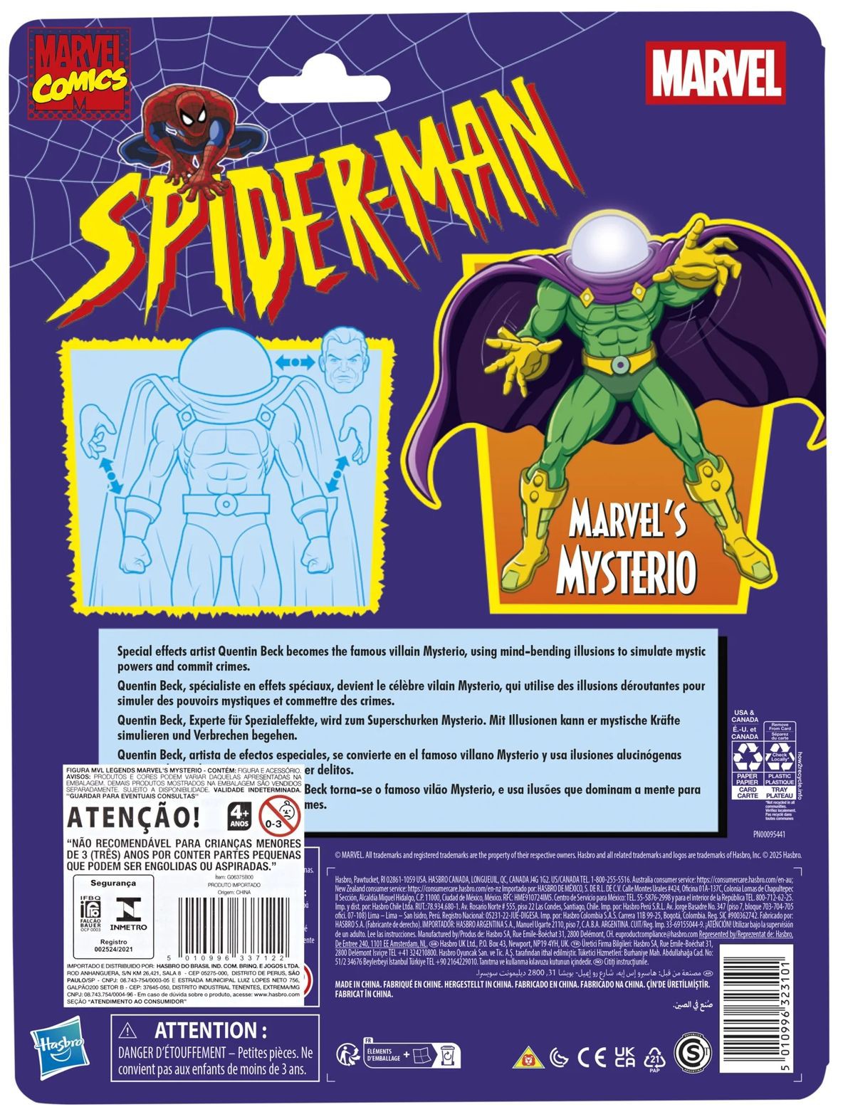 Hasbro præsenterer inden for Marvel Legends Series denne ledede figur af Mysterio, inspireret af hans udseende i Spider-Man: The Animated Series. Figuren er cirka 15 cm høj og har flere bevægelsespunkter for dynamiske positurer. Designet er premium og tro mod animationsserien. Indeholder et alternativt hoved uden hjelm med Quentin Becks ansigt, to ekstra hænder og tre effektdel (to røgspiraler og én kranieeffekt). Leveres i retro-blisteremballage med illustrationer. Begrænset udgave.