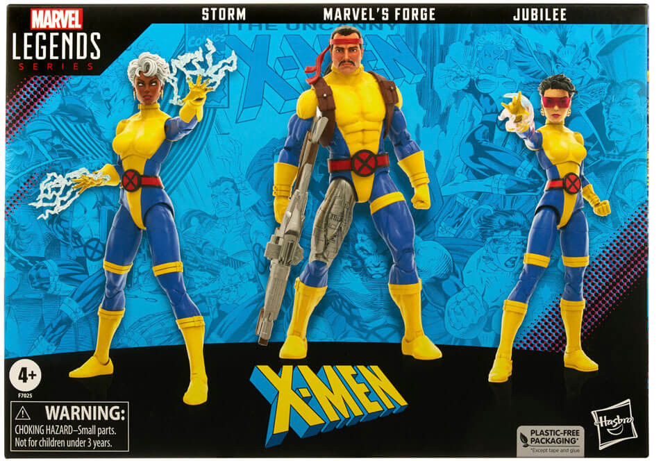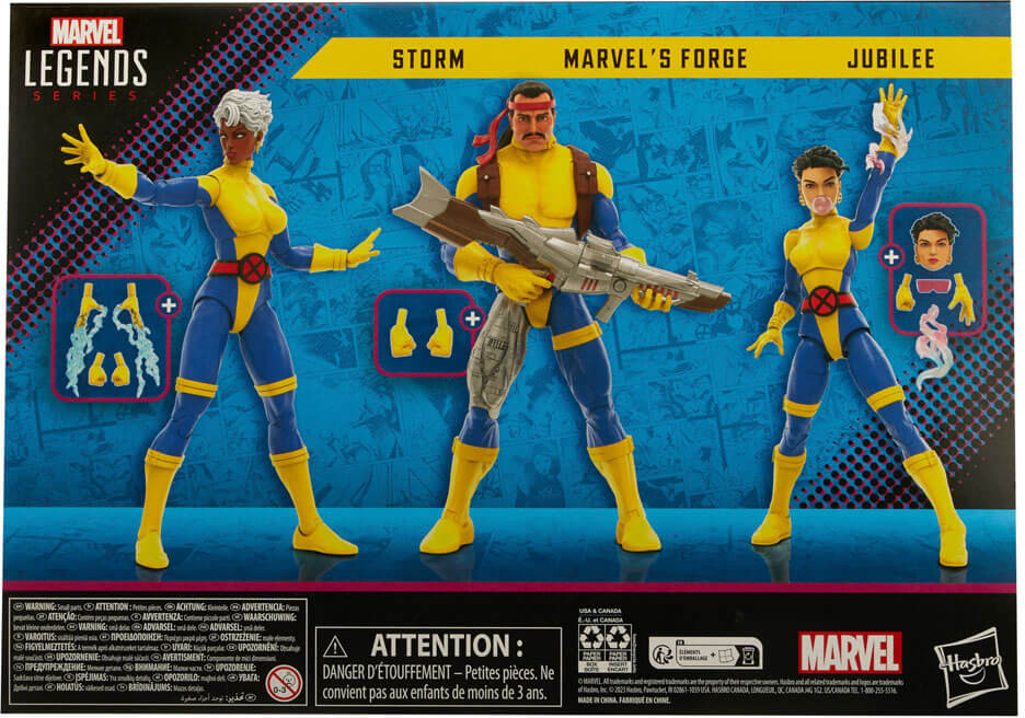 This collectible 6-inch-scale Marvel action figure set is detailed to look like the Marvel's Forge, Storm, & Jubilee characters' appearance on the cover of Uncanny X-Men #275, featuring premium detail and multiple points of articulation. It comes with 13 accessories including alternate hands and blaster rifle for Marvel's Forge. Storm figures includes alternate hands with weather-controlling effects. Jubilee figure includes and sunglasses, an alternate head with bubble-gum bubble, alternate hands and 2 mutant firework effect accessories.