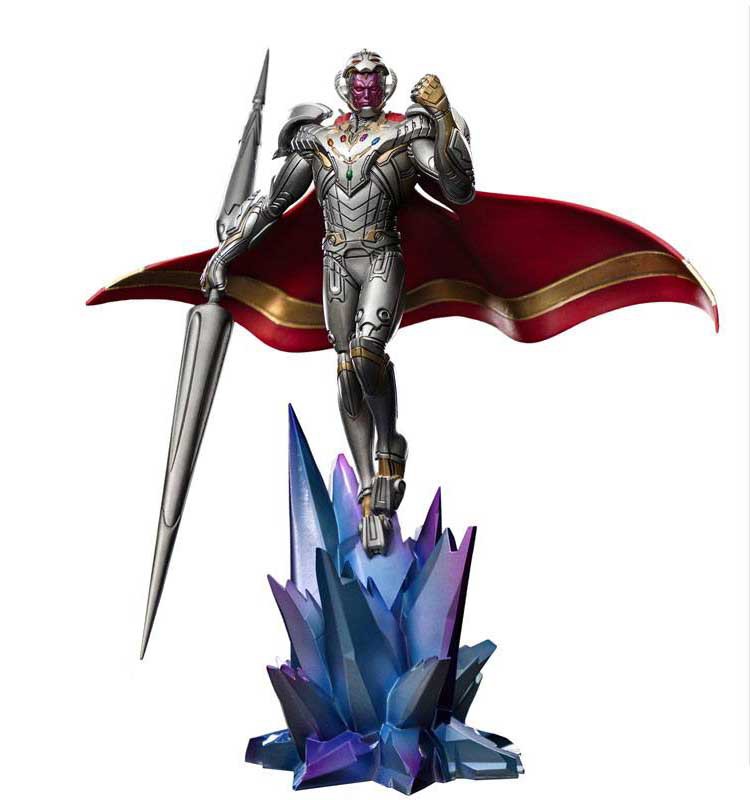 Just like a technological medieval knight on his universal crusade, the fearsome cyber tyrant brings five Infinity Stones integrated into the chest plate of his indestructible armor, in the form of an exoskeleton with a red cape, created with the power of the Mind Stone to hold the mighty gems and make it capable of channeling their energy. With his original mechanic head transformed into a helmet to cover the lilac face of his new hybrid android body, with the Mind Stone embedded on his forehead, and carrying his Double-Headed Spear in his right hand as his main physical weapon, the evil artificial being defiantly raises his left fist clenched, levitating over the bluish-purple crystals of the Mirror Dimension, ready to fulfill his mission of purging the chaos from every existing universe. Derivative from the animated series What If...? produced by Marvel Studios and released on Disney+, Iron Studios bring the statue "Infinity Ultron Deluxe - What If...? - Art Scale 1/10", with the villain that became the biggest menace to all the different realities on Marvel's multiverse.