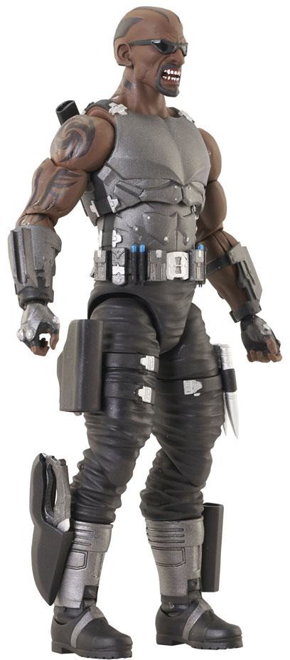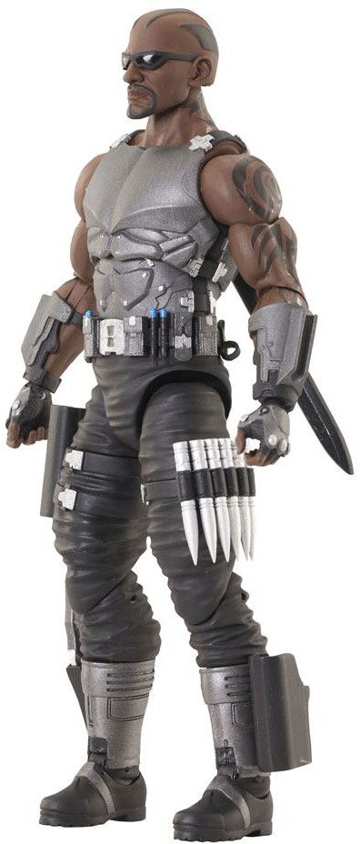 Vampires beware! The fearless vampire hunter Blade has arrived in the Marvel Select action figure line, and he is ready for war! Equipped with an arsenal of weapons, including sword, guns, stakes and more, the Daywalker also includes interchangeable normal and vamped-out heads. Standing approximately 7 inches tall, this collector-edition action figure features 16 points of articulation and comes in display-ready Select action figure packaging, with side panel artwork for shelf reference.