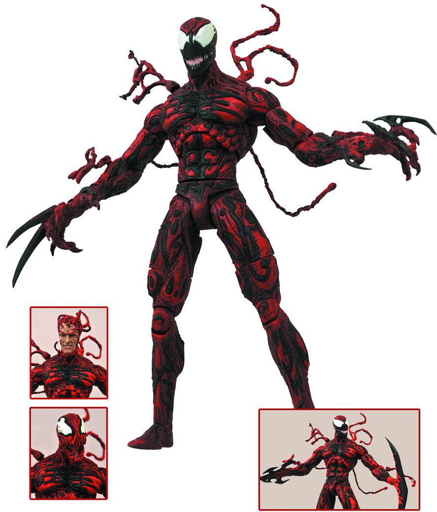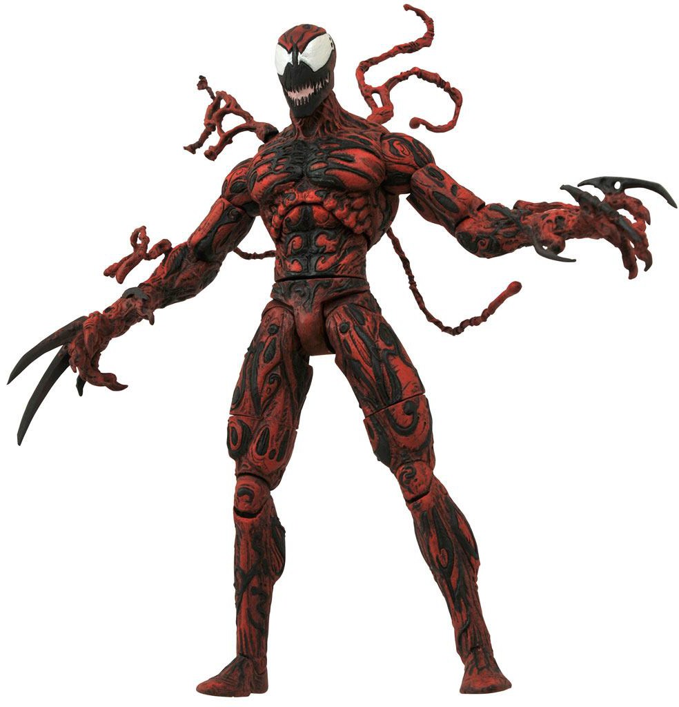 A Diamond Select Release! Spider-Man's deadliest foe returns! The sold-out, fan-favorite, highly in-demand Carnage action figure makes its triumphant return to the Marvel Select line, and it's every bit as awesome as it's always been! Standing approximately 20 cm tall, the symbiotic slayer features numerous interchangeable parts including axe hands, claws, tendrils, and an interchangeable Cletus Kasady head! With approximately 16 points of articulation, Carnage comes packaged in the display-ready Select action figure packaging, with spine artwork for shelf reference.