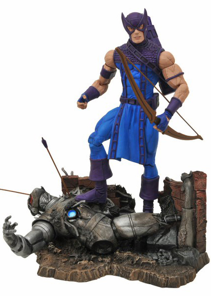 A Diamond Select Release! Sculpted by Jean St. Jean! The eagle-eyed Avenger Avenger has returned to the Marvel Select line in his classic incarnation, as a fully articulated 7" action figure with 16 points of articulation! This comic-based Hawkeye figure includes his bow, multiple arrows (including one with the Wasp perched on it) and a detailed display base featuring the fallen form of Ultron. All are packed in the famous Marvel Select display packaging.