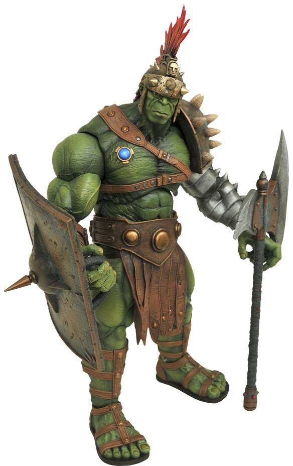 Let the games begin! This action figure of the Hulk depicts him in his gladiator armor from the character-redefining "Planet Hulk" storyline in The Incredible Hulk comics. The figure stands approximately 10" tall (11.5" with his feather crest) and features 16 points of articulation, allowing him to strike a wide variety of combat-ready poses. Accessories include an 8"-long battle axe and a 5" tall spiked shield. Sculpted by Jean St. Jean.