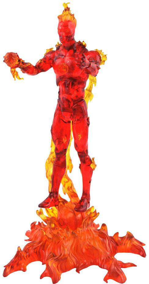 Flame on! The Fantastic Four's hot-headed member gets his first-ever Marvel Select action figure with this all-new release! Standing approximately 7" tall and featuring 16 points of articulation, this figure is cast in translucent material, and comes with interchangeable flame effects, a flight stand and a Golden Age Torch head! It comes packaged in display-ready Select packaging, with side-panel artwork for shelf reference. Designed by Eamon O'Donoghue, sculpted by Chris Dahlberg!