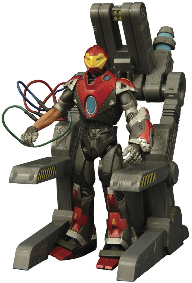 Featuring several points of articulation, Ultimate Iron Man features removable armor on his arms and wires to interface his arms with the machine as depicted on the cover. Blister card packaging.