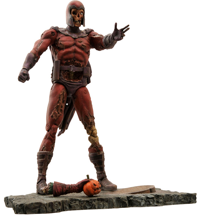 Magneto is back for revenge ... and your brains! This all-new action figure of X-Men villain Magneto features decomposing and battle-damaged details, inspired by his zombified appearance in the horror comics of the Marvel Universe.