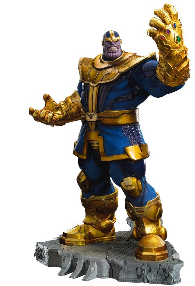 On the base of a cracked floor referring to the cold marble of a temple built to pay homage to Death, the Titan raises his gloved left hand with his Infinity Gauntlet, flaunting the power of a demigod with this artifact made to store six cosmic singularities transformed into stones, each of them representing an aspect of the universe: the space, the time, the mind, the power, the soul, and the reality, making its user almost omnipotent. In love with the personification of Death in the shape of a beautiful woman, his plans usually include universal genocide to court his beloved, portrayed in the statue next to him in the form of a bust on a pedestal. Crazy, eternal, and inevitable, he is all that and much more, and answering the request of fans and collectors, Iron Studios proudly present the statue "Thanos - Infinity Gauntlet Diorama - BDS Art Scale 1/10", the first of a new series composed by the most powerful heroes on earth from the universe of Marvel, in a collection that will form another incredible battle diorama set.