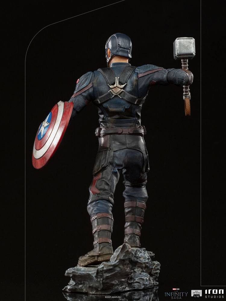 Set on a base shaped like rocky terrain, home to the battlefield of Earth's greatest heroes against the invading forces of the fearsome Titan Thanos and his army of aliens led by his Black Order generals, Iron Studios presents "Captain America Ultimate BDS Art Scale 1/10 - The Infinity Saga - Iron Studios", with the legendary captain Steve Rogers with his inseparable shield on his left arm, which was damaged by Thanos's force, but always ready for combat, and asserting his nobility, holds the enchanted Mjölnir in his right hand, something only allowed to the most worthy. Inspired by the unforgettable scene in which, in front of his allies, he finally speaks the famous rallying cry of heroes in the comics: "Avengers Assemble", something very anticipated by fans.