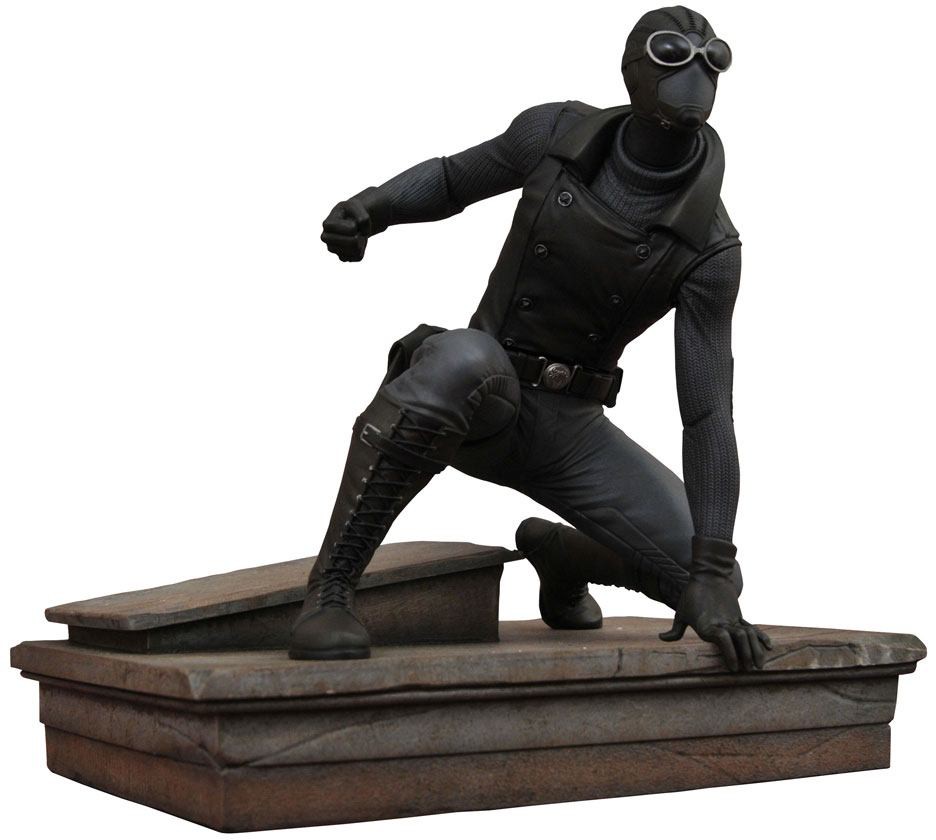 Time to go into the Spider-Verse! Enter the dark and dirty alleyways of New York City with the darkest Spider-Man of all, Spider-Man Noir! Measuring approximately 7 inches tall, this sculpture of the hard-boiled hero shows him crouching on a rooftop, overlooking his city. This PVC Diorama is made out of high-grade plastic, and features detailed sculpting and paint details. Packaged in a full-color window box with fifth-panel door. Sculpted by Cortes Studios.
