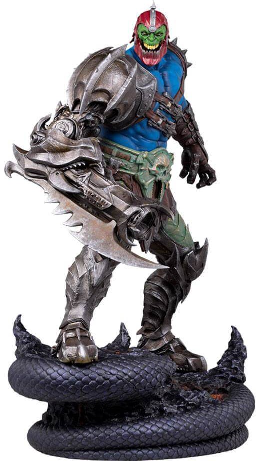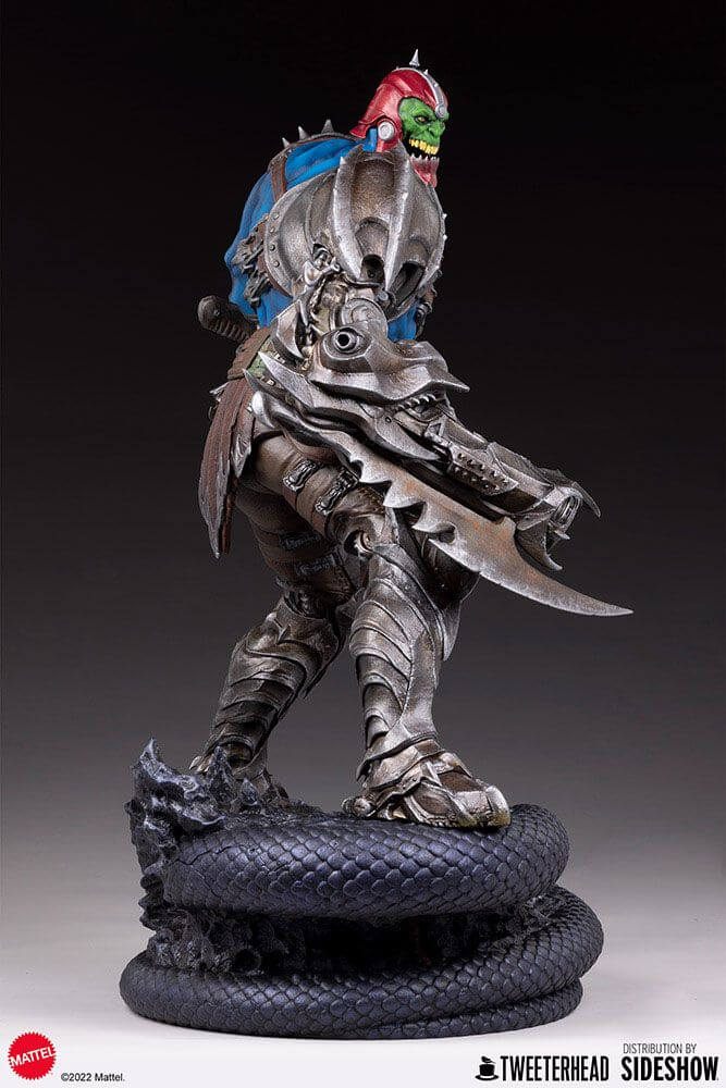 The Trap Jaw Maquette measures 20" tall, 11.5" wide, and 12.75" deep when fully assembled. He stands atop a Snake Mountain themed base, which matches with other Evil Warriors in the Legends collection like the Mer-Man Legends Maquette and the upcoming Skeletor Legends Maquette. This MOTU collectible maquette is fully sculpted and painted to reimagine his classic appearance with an even more intimidating new style.