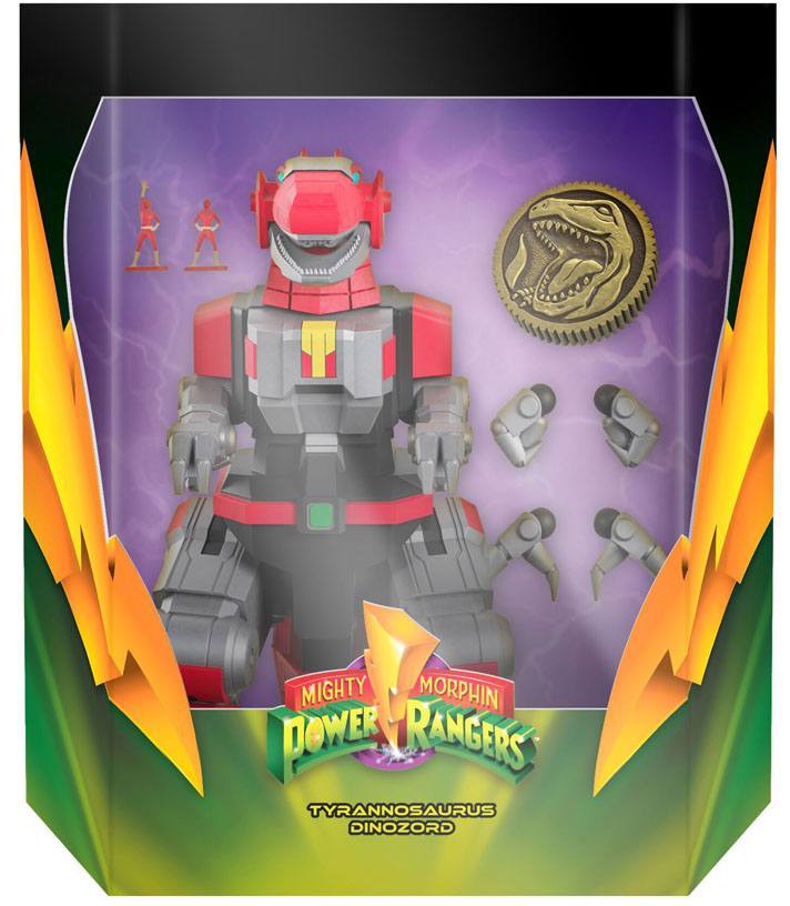 Piloted by the Red Ranger, the Tyrannosaurus Dinozord erupts from the earth to fight the evil forces of Rita Repulsa. This mighty zord is capable of taking on Rita Repulsa's Evil Space Aliens one-on-one! In combat, it uses its tail to hold its body up and deliver a devastating kick, and one roar can vaporize any opponent. This highly detailed, fully articulated deluxe Tyrannosaurus Dinozord ULTIMATES! figure stands 8" tall (and even longer from head to tail!) and comes with a variety of interchangeable parts and accessories. It's no tall "tail"- your MMPR collection calls for the Tyrannosaurus Dinozord ULTIMATES! figure!