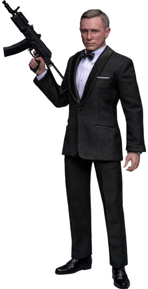 Exquisitely crafted based on Daniel Craig's role as James Bond, the figure features a newly developed head sculpt with distinguished likeness and separate rolling eyeballs to enhance figure's realism. The fabric costume is finely tailored to showcase James Bond's classic gentleman appearance. Layering a black tux jacket with pocket square detail over a white dress shirt, the tux look is finished with a black bow tie and a watch. Additionally, two types of pistol and a machine gun are included to enhance the display on top of the gun barrel-themed backdrop and figure stand.
