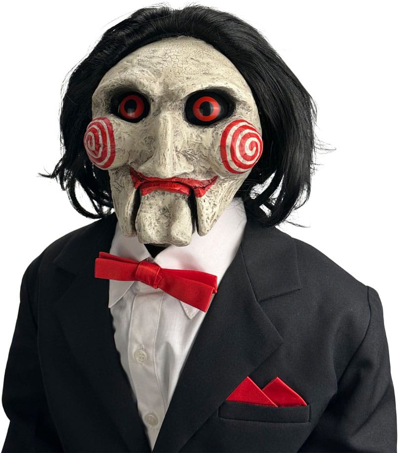Jigsaw's main accomplice and icon of the film franchise, the officially licensed, Saw - Billy the Puppet Deluxe Prop is a must for any collector. This amazing prop is 1:1 scale features a vinyl head, moving mouth, light-up eyes, posable arms and hands, plush legs and a weighted torso for easy sitting. Pressing the wrist plays 2 sound clips right from the film.