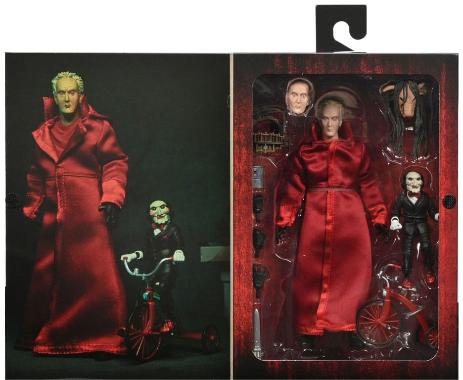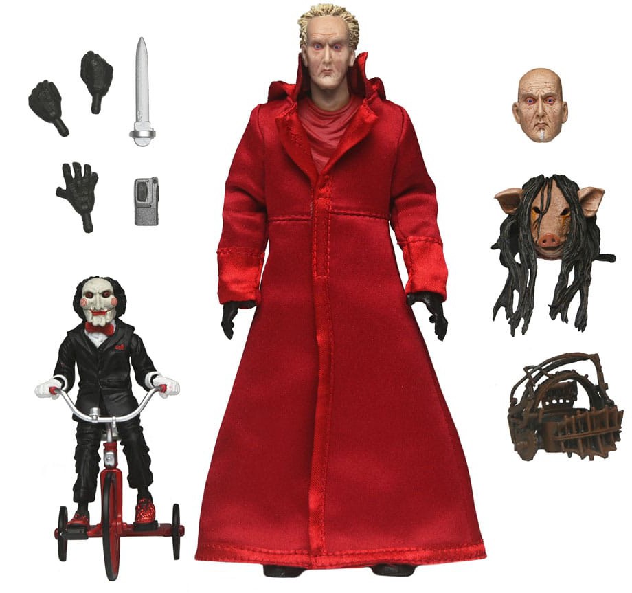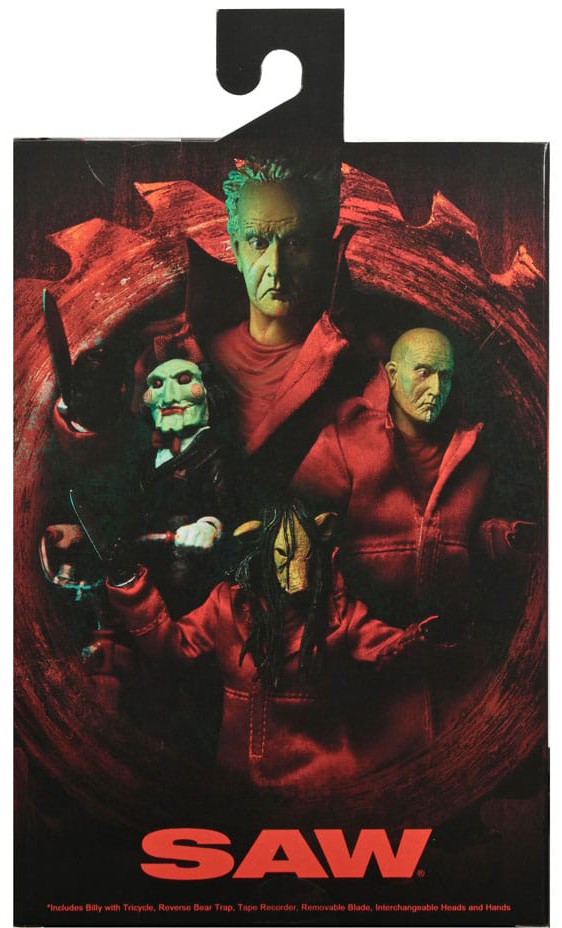 In the Saw movies, The Jigsaw Killer abducts the morally wayward in a twisted attempt to teach his victims the value of life. Once captured, his prisoners must face impossible choices in a horrific game of survival as he communicates with them through an eerie puppet. This 7" Saw action figure in a red robe gets the Ultimate treatment, with a fully articulated body under a wired fabric robe. Accessories include: interchangeable heads and hands, pig-mask head, puzzle head-trap, tape recorder, extended blade, and Billy the Puppet with Trike. Collector-friendly window box packaging with opening front flap.