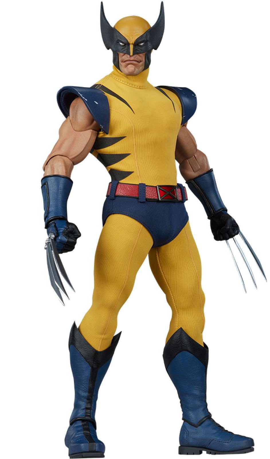The Wolverine Sixth Scale Figure features a comic-inspired head sculpt of everyone's favorite feral mutant, with a stern expression beneath his yellow and black finned cowl. Wolverine's costume includes a yellow fabric bodysuit with black stripes, a set of blue fabric briefs, and a red fabric belt with an 'X' buckle. His classic costume also has sculpted elements like distressed blue shoulder armor as well as blue and black gauntlets and two-part boots.