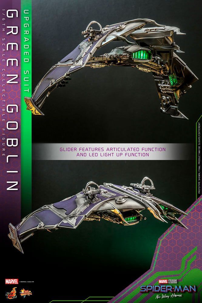 Expertly crafted based on Norman Osborn/ Green Goblin's maniacal portrait in Spider-Man: No Way Home, the movie-accurate figure features a newly developed head sculpt of Willem Dafoe as Norman Osborn with separate rolling eyeballs, realistic wrinkles, and hair sculpture. His upgraded costume painted in metallic green color with battle-damaged effects, a distressed poncho, highly-detailed accessories including goggles, pumpkin bombs, attachable blades, his trademark Goblin Glider in one-sixth scale with LED light-up design and articulated function.