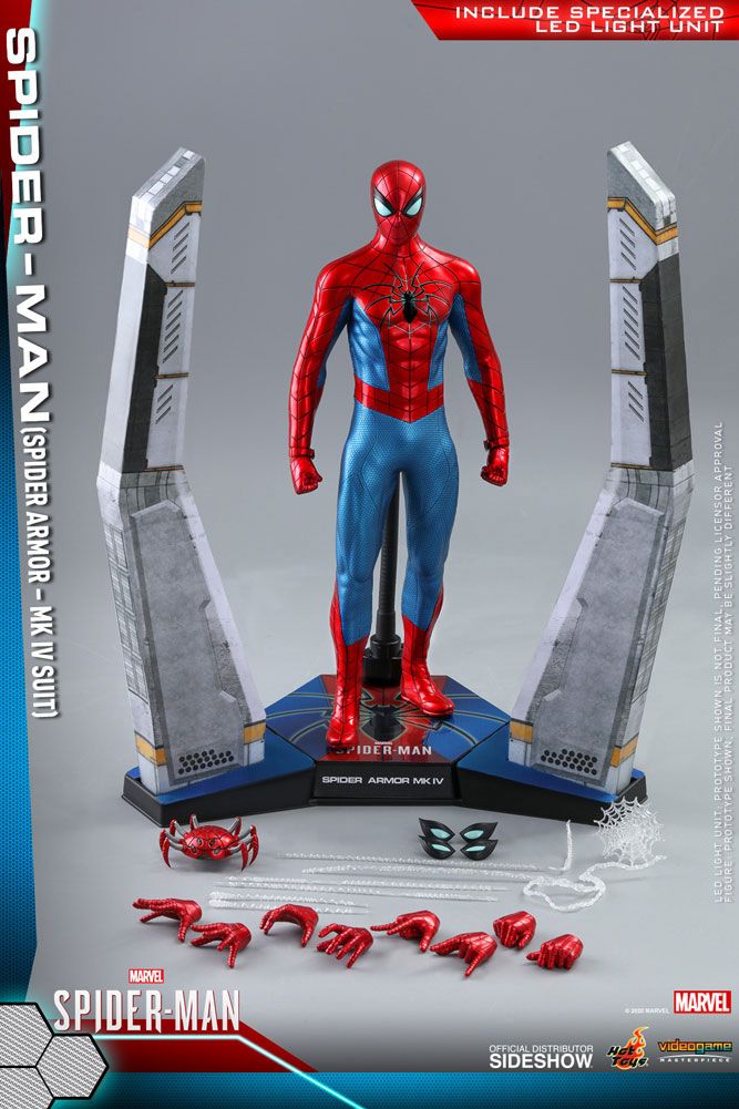 Sideshow and Hot Toys present Spider-Man (Spider Armor - MK IV Suit) Sixth Scale Collectible Figure! Incorporated with stunning luminous reflective web pattern which appears under specialized LED lighting exposures Hot Toys has re-created the powerful and technologically impressive Spider Armor - MK IV Suit that accentuates its visual effect with incredible details.