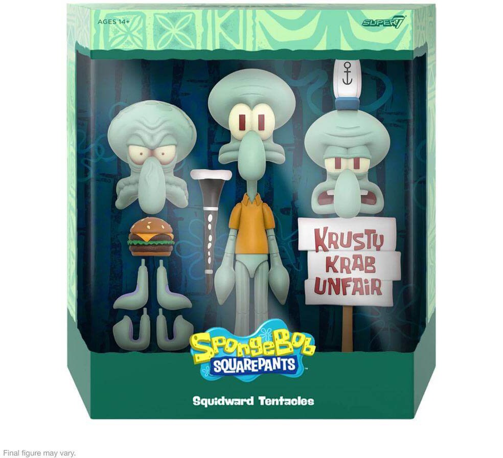 Squidward fancies himself as the only sophisticate in a sea of (Bikini) bottom feeders and he's not shy about reminding everyone that they're stifling his artistic genius. This highly articulated 7" scale SpongeBob SquarePants ULTIMATES! figure of Squidward comes with interchangeable heads & hands and a variety of accessories, including his clarinet and a Krabby Pattie burger. He's annoyed by everything and everyone around him, but a change of scenery might do Squidward some good. Add the made-to-order Squidward ULTIMATES! figure to your collection and finally give him the sense of appreciation he feels he deserves!