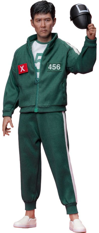 The highly accurate sixth-scale action figure is masterfully crafted based on the appearance of Lee Jung-jae as Seong Gi-hun in Squid Game, featuring a newly developed head sculpt with separate rolling eyeballs, and a newly designed body that is pulled together with a faithfully tailored Squid Game tracksuit with No. 456 embroidery and cross sign badge details. In addition to Seong Gi-hun, a series of accessories appears in the Squid Game is included: a USB-powered voting machine, a Piggybank, a mask accessory with square symbol, a six-legged pentathlon game set consisting of a pair of ankle cuffs, a pair of Ddakji, a pair of Biseokchigi, a set of Gonggi stones, a shuttlecock, a spinning top, and a special figure base designed to replicate the staircase setting.
