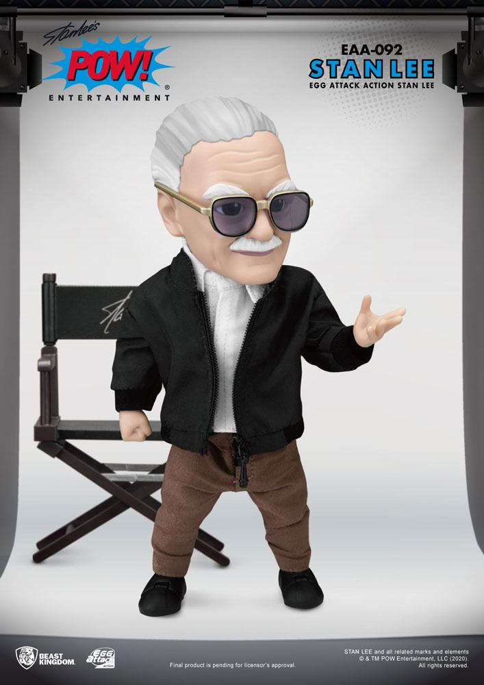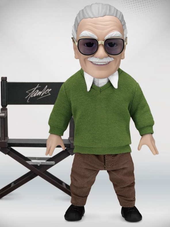 Beast Kingdom's Entertainment Experience Brand, launches the EAA Stan Lee, a highly articulable 6-inch action figure of the 'main-man' of Marvel himself. The highly stylized Egg Attack Action design, perfectly suites the charm and mild mannered demeanor of Stan Lee. Using real fabrics, he is seen sporting his signature, white shirt, khaki trousers, dark blue jacket, and/or green sweater. Two head sculpts allows collectors to pose Stan with different expressions. Apart from the three pairs of replaceable hands, the set includes one Stan Lee characteristic hand and one director's chair for fans to enjoy one of Stan's most famous poses.