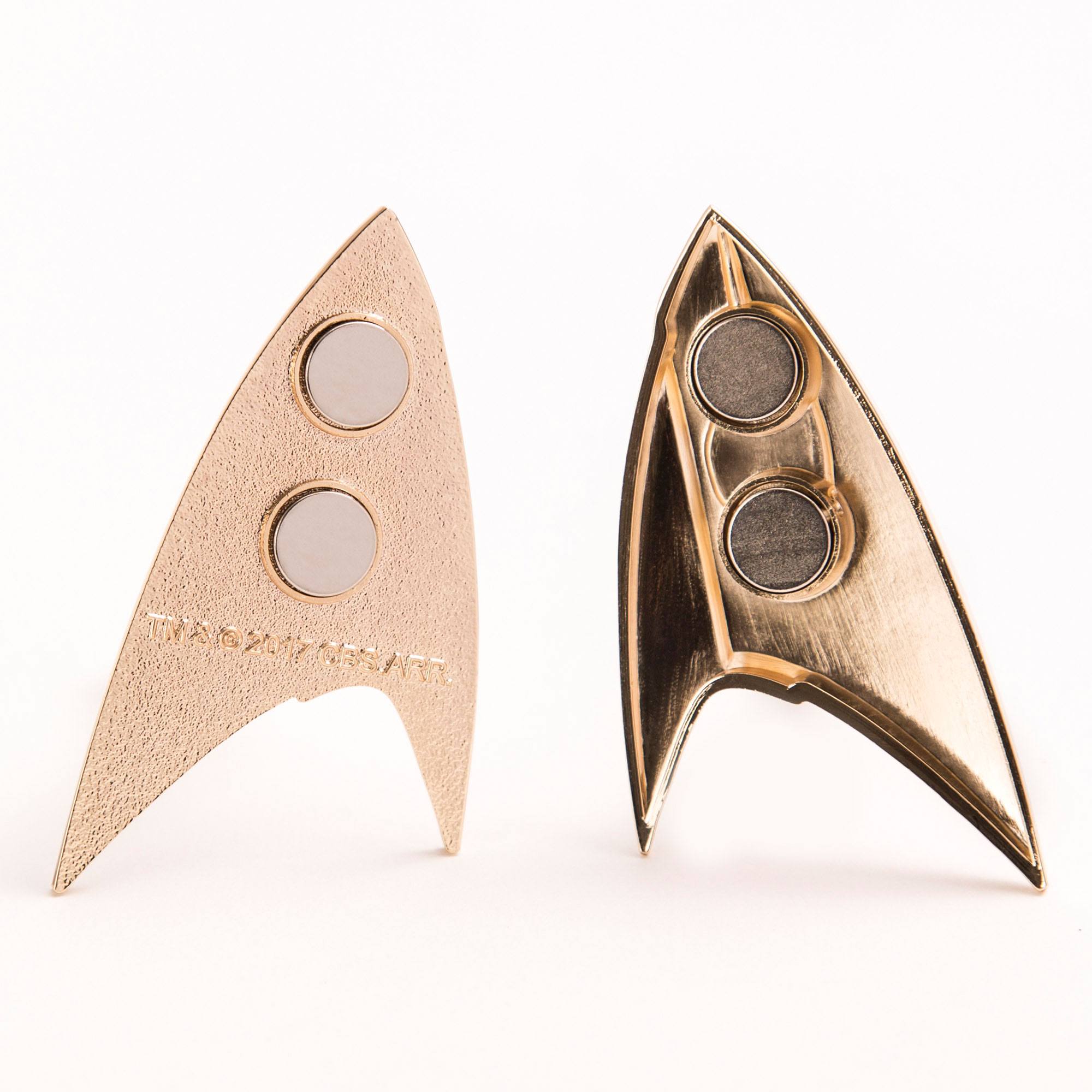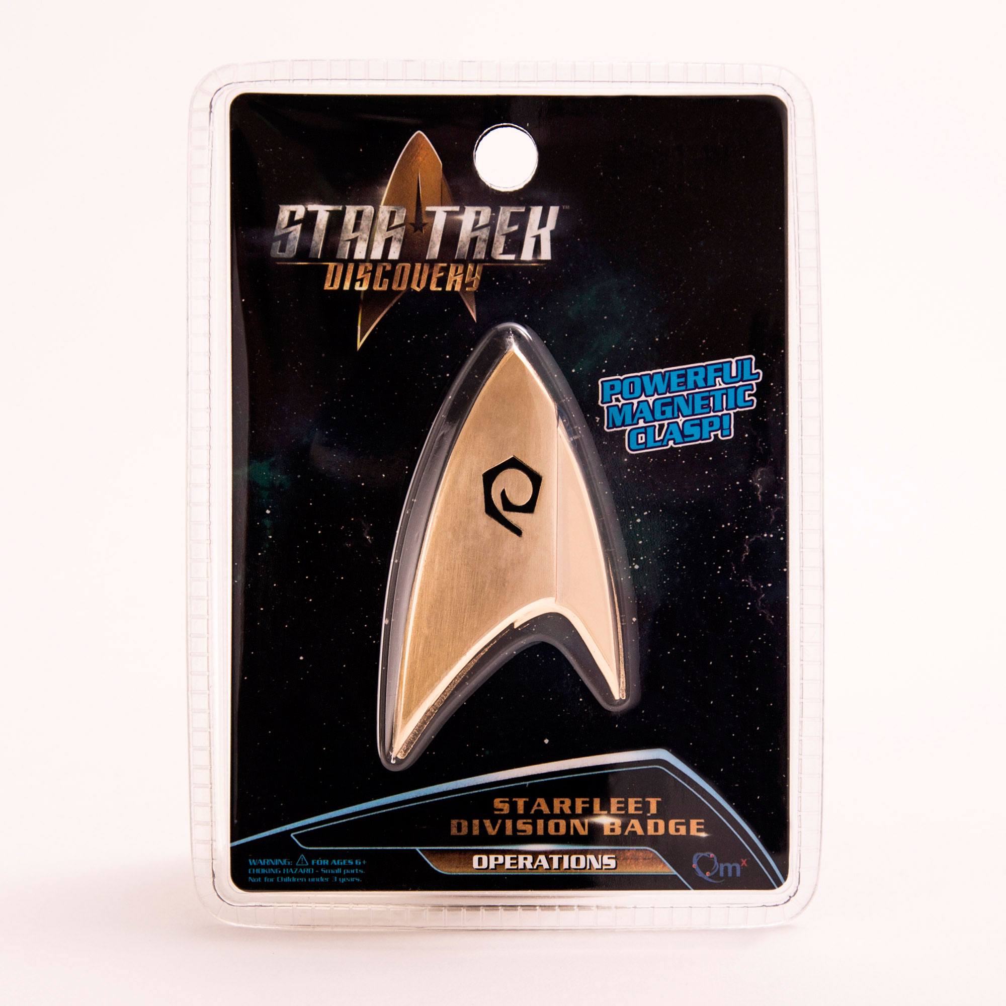 From Star Trek: Discovery comes all new Starfleet Federation insignia badges brought to you exclusively by QMx. The American television series with a Fall 2017 is set a decade before the original Star Trek series. Discovery's badges feature a unique split-delta design, with brushed metal on the raised portion and a glossy finish on the opposite side. The silver-tone science insignia features a oval crossed by an oval - both of them rounder than before. As with all of our Starfleet Division badges, the ones for Discovery are exact replicas of the uniform insignia from TV series, with each design taken directly from the screen-used hero prop. What sets these wearable badges apart from the original is the clasp, which uses strong, short-field magnets that are embedded in each badge itself and in a glossy backplate. No more pinholes in delicate fabric. They can even be worn on leather and suede. All four Star Trek: Discovery magnetic insignia badges are available separately: Command, Science, Operations and Medical.