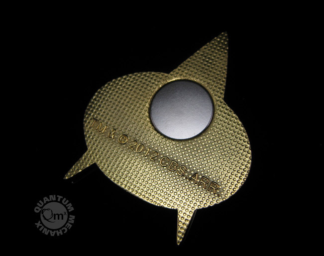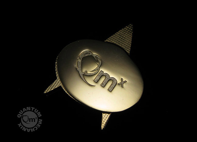 Quantum Mechanix TNG communicator badge was crafted using one of the only remaining sets of original molds, painstakingly restored in Quantum Mechanix artisan model shop. With the restored molds they were able to replicate the prop´s size and shape exactly. To get the colors and paint details, Quantum Mechanix studied an actual screen-used badge. And once they had the design of the original matched, they took the whole thing a step further - rendering the replica in gold and silver-finished metal (the on-screen props were made of painted resin).
