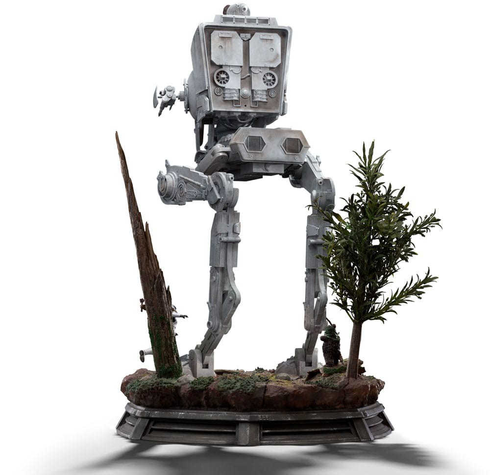 On a small moon in the Outer Rim, covered by dense forests, high mountains, and savannas, home to species like the small and furry tribal Ewoks, a Wookiee warrior volunteers for the team tasked with destroying the shield generator of the second Death Star, a moon-sized battle station built by the Galactic Empire as the successor to the first Death Star, and partially completed. On this mission, the charismatic giant furball, with the help of the local natives, manages to take control of a two-legged combat walker, the AT-ST, and use it in his mission against imperial troops guarding the generator. This iconic scene from the movie Star Wars: Episode VI - Return of the Jedi is meticulously recreated by Iron Studios in the statue "AT-ST and Chewbacca - Star Wars - Demi Art Scale 1/20", featuring Chewie emerging from the hatch on top of the AT-ST, alongside the Ewoks battling a Stormtrooper and turning the tide of the battle in favor of the Rebel forces. On a forest diorama base of Endor, the statue also offers the option for the top hatch to be closed.