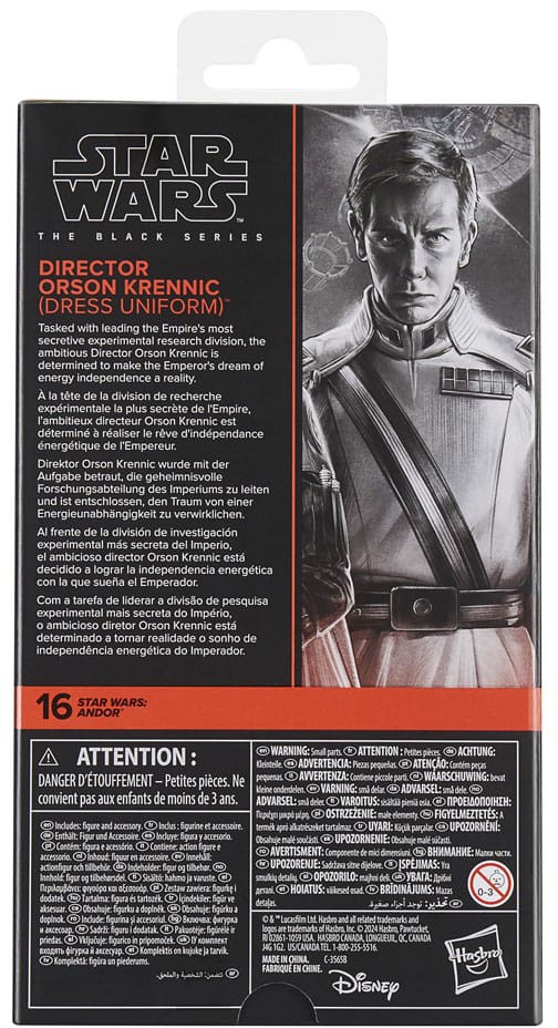 Star Wars The Black Series includes 6 inch action figures, vehicles, and roleplay items from the 40-plus-year legacy of the Star Wars Galaxy, letting fans create galactic scenes with a faithfulness to Star Wars comic books, movies, series, and more. This Star Wars Hasbro action figure is detailed to look like Director Orson Krennic from Star Wars: Andor. With exquisite features and decoration, The Black Series embodies the quality and realism that Star Wars devotees love. May the Force be with you!