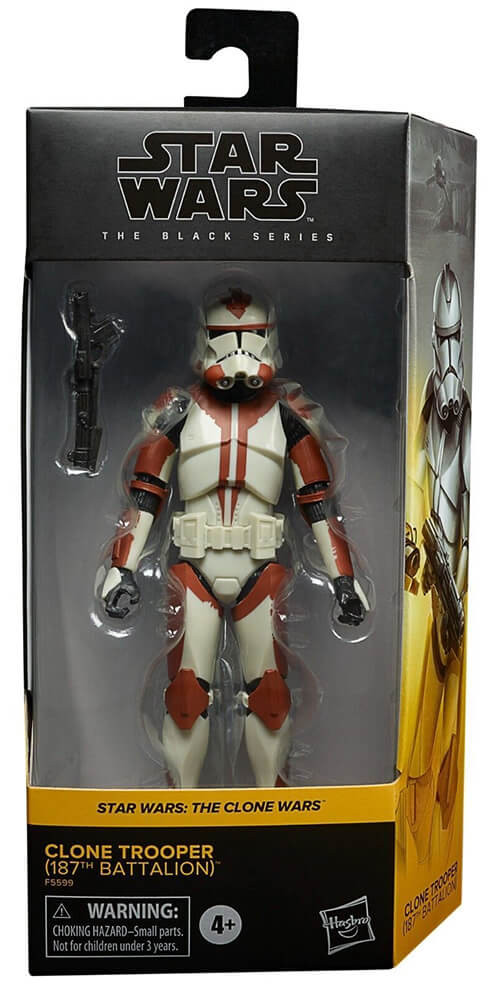 The 6-inch-scale Black Series figure is detailed to look like the Clone Trooper (187th Battalion) character from Star Wars: The Clone Wars, featuring premium detail and multiple points of articulation.
