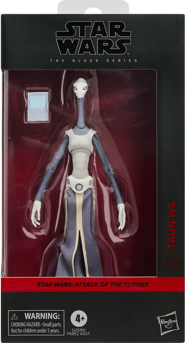 Figuren har filmtro skulptur og en højde på cirka 17,8 cm i 15 cm-skala, hvilket gør hende til et elegant og iøjnefaldende indslag i Star Wars Black Series-samlingen. Med den medfølgende datapad kan Taun We poseres i scener, der afspejler hendes rolle på Kamino.