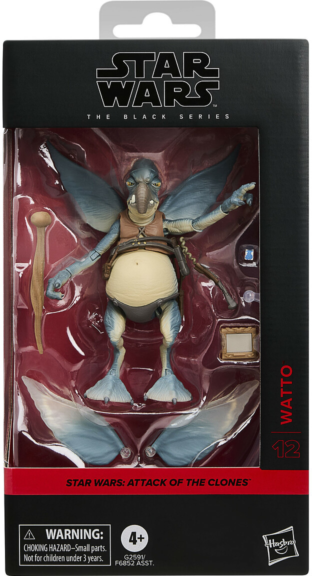 Figuren har filmtro skulptur og en højde på cirka 10 cm i 15 cm-skala, hvilket gør den perfekt til udstilling sammen med andre Star Wars Black Series-figurer. Med karakterinspireret tilbehør som stok, datapad, udskiftelige vinger og en gennemsigtig stand kan Watto poseres svævende i luften.