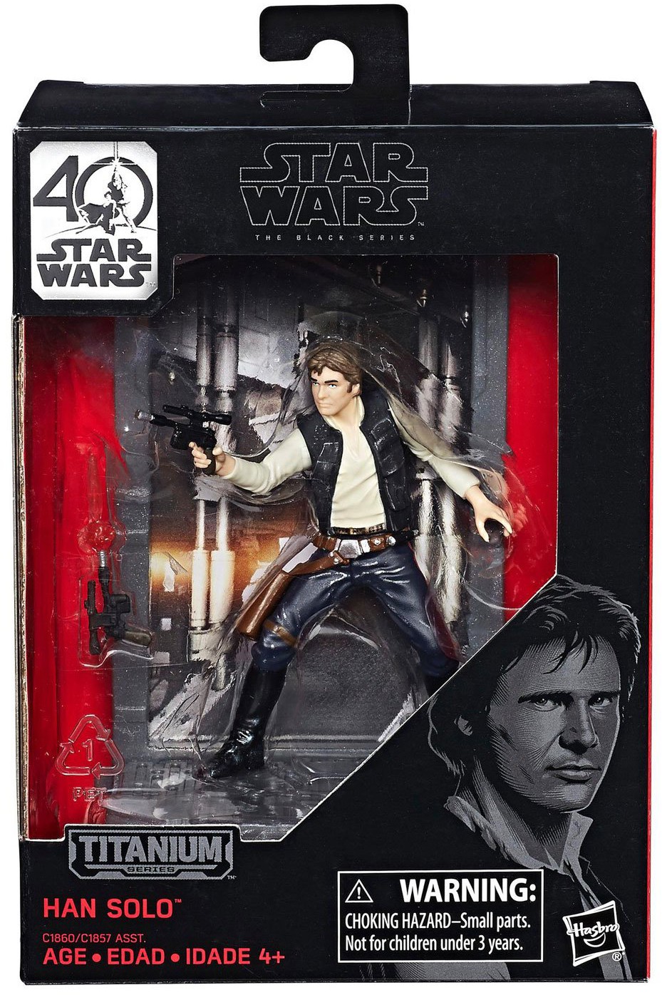 From Hasbro's "Black Series Titanium Series" comes this assortment of 5 highly detailed metal figures. Each figure stands approx. 10 cm tall and comes with base, backdrop and two variants of their signature weapon.