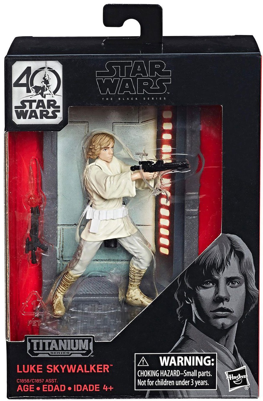From Hasbro's "Black Series Titanium Series" comes this assortment of 5 highly detailed metal figures. Each figure stands approx. 10 cm tall and comes with base, backdrop and two variants of their signature weapon.
