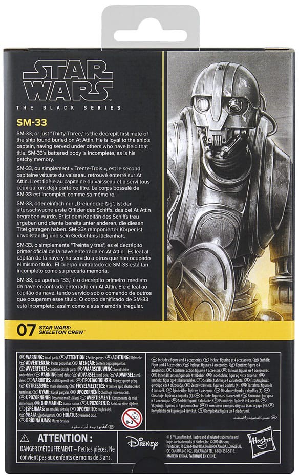 Star Wars The Black Series includes 6 inch action figures, vehicles, and roleplay items from the 40-plus-year legacy of the Star Wars Galaxy, letting fans create galactic scenes with a faithfulness to Star Wars comic books, movies, and series. This Star Wars Hasbro action figure is detailed to look like SM-33 from Star Wars: Skeleton Crew. With exquisite features and decoration, The Black Series embodies the quality and realism that Star Wars devotees love. May the Force be with you!