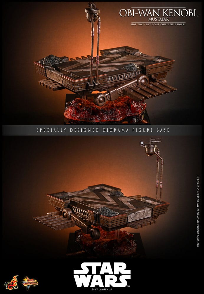 The Star Wars figure features a finely tailored costume applied with weathering effects to reflect the intensity of the battle on Mustafar. His outfit includes a tabard, outer and under tunics, a fabric obi, and a detailed utility belt, paired with pants and long boots. Included are nine interchangeable hands and blue lightsaber blades with both LED-lighted and non-lighted hilts for versatile posing. The specially designed diorama base features a repulsor platform and lava effects, replicating the volcanic landscape of Mustafar and allowing collectors to recreate the legendary duel between Obi-Wan and Anakin.