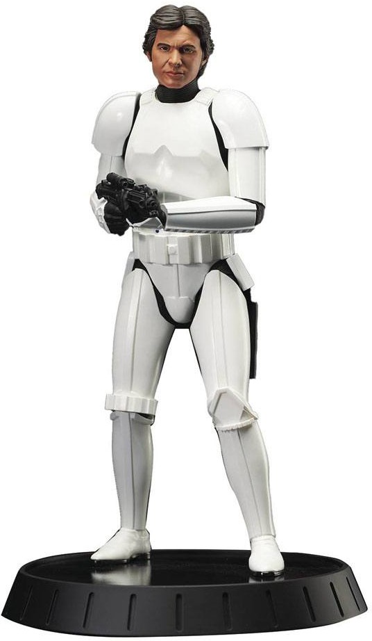 I've got a good feeling about this! Han Solo dons his stormtrooper disguise for this new Milestones 1/6 Scale Statue! Depicting Han with Imperial blaster raised, and featuring interchangeable helmeted and un-helmeted heads, Han stands approximately 12 inches tall atop a black disc base, and is limited to only 1000 pieces! It comes packaged with a numbered certificate of authenticity in a full-color box.