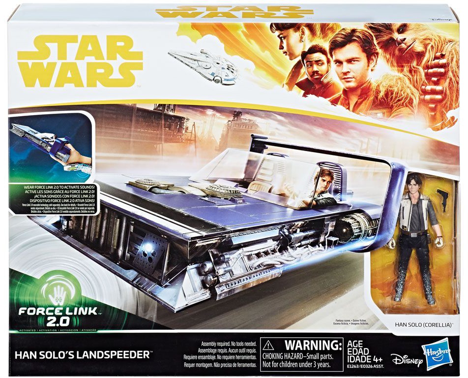 When kids wear their Force Link 2.0 wearable technology and pick up the 3.75-inch-scale Star Wars Han Solo Landspeeder vehicle, they can activate flying sound effects! When they pick up their Han Solo (Corellia) figure, they can activate authentic phrases and sounds! The Han Solo Landspeeder vehicle features a crumple zone that lets kids pretend to crash the landspeeder and eject their figure, so when kids load the figure into the seat of the speeder, they can send it launching! With Force Link 2.0 toys, kids control the Star Wars action! May the Force be with you!