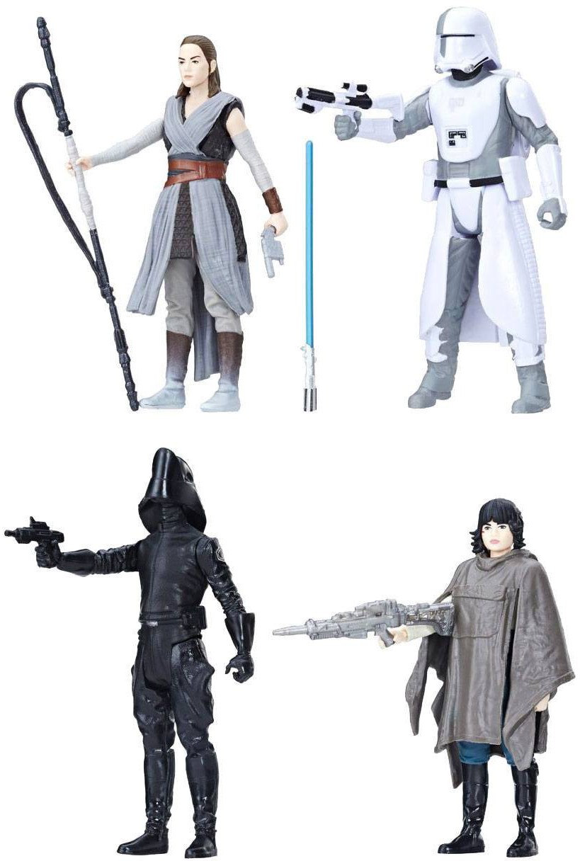 From "Star Wars: The Last Jedi" comes this pack including action figures of Rey, First Order Snowtrooper, First Order Gunner and Rose. The 3 3/4-inch scale figures come with accessories in a window box packaging.