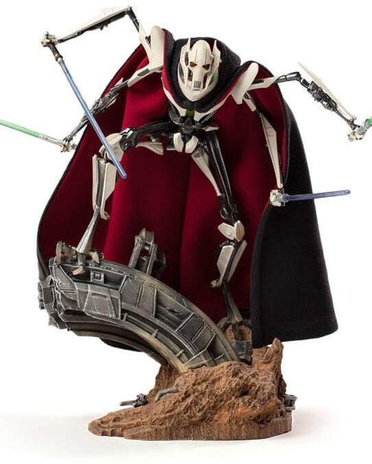 Wielding four different lightsabers, combat spoils with brave Jedi knights who dared to face him, this feared warlord imposes fear on his enemies through his cold yellow eyes, one of his few organic parts, hidden by relics from his past, like his real face behind a mask and a removable cover made of fabric that covers his robotic body, adornments that are characteristic of his species. On a diorama base that refers to a battlefield, supported by technological metallic remains, embedded in the surface of arid terrain, this fearsome enemy of the Jedi Order and the Galactic Republic poses, prepared to exterminate anyone who gets in his way.