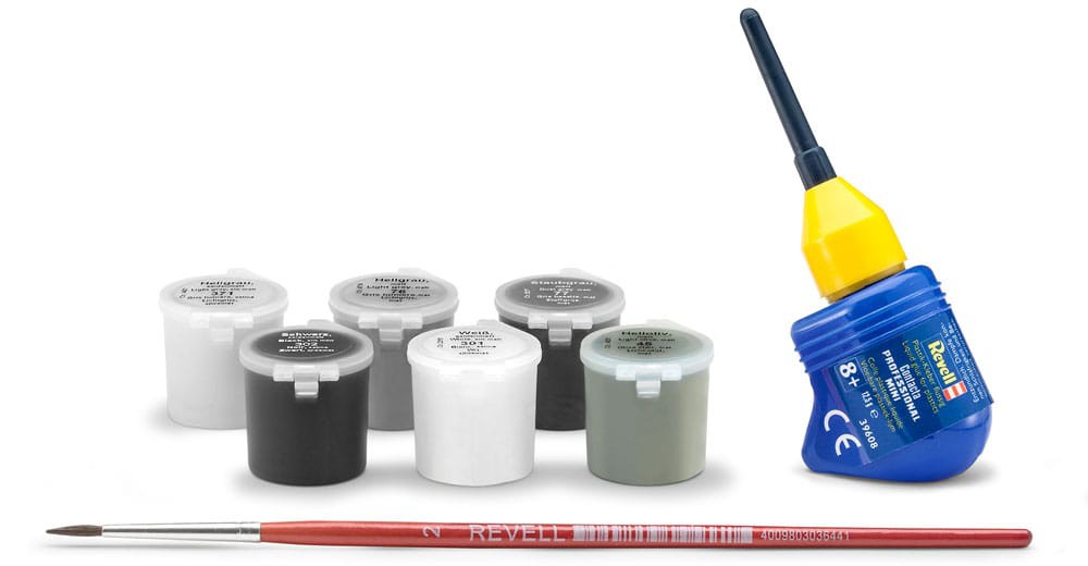 - In addition to basic colours, adhesives and brushes are also included.