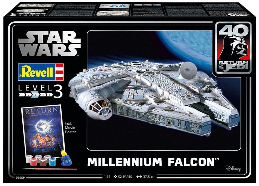 Fejr 40-års jubilæet for den klassiske film "Return of the Jedi" fra 1983 med dette gave sæt med Millennium Falcon i specialudgave! Millennium Falcon var et stærkt modificeret YT-1300 let fragtskib, der ejes af corellianeren Han Solo efter adskillige ejerskift. Dette detaljerede modelsæt i skala 1/72 med 52 dele har en bevægelig rampe, klare dele, roterende antenne, pilotfigurer og mulighed for at bygge med forlængede landingsben eller lukkede bugter. Det leveres også med en plakat, lim, pensler og vigtig maling, så du kan komme i gang med det samme. Den perfekte gave til enhver "Star Wars"-fan og spirende modelbygger!